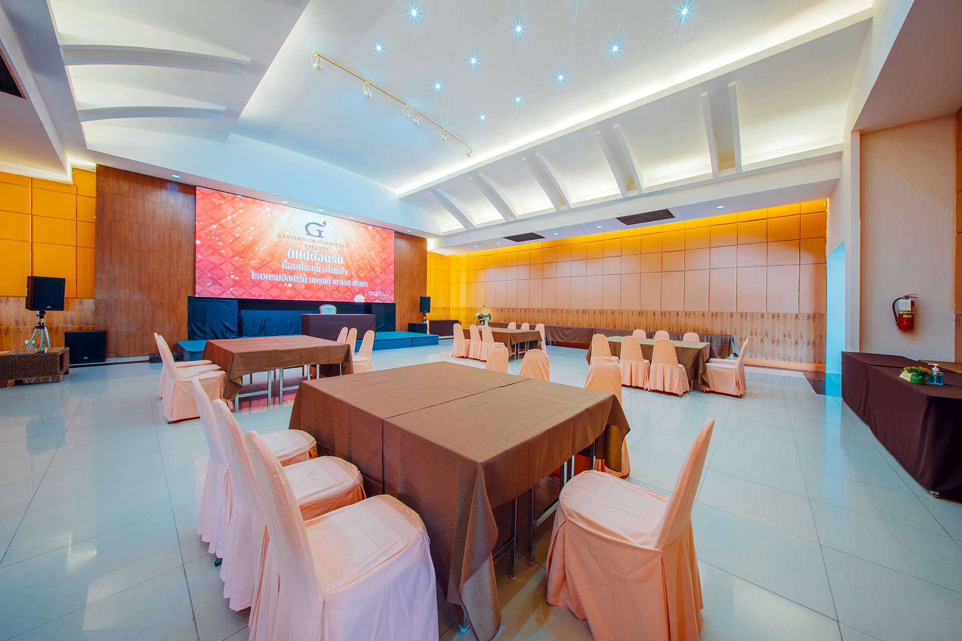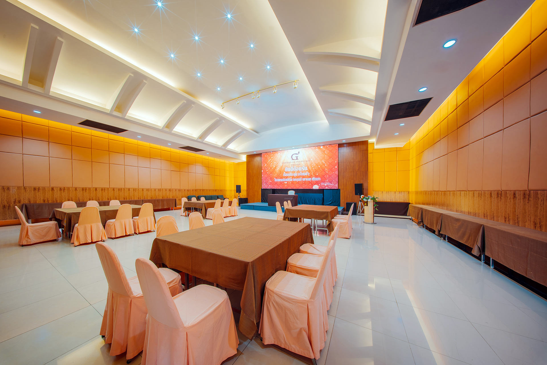 This function room is equipped with state-of-the-art meeting equipment including a full-sized 200 inch programmable LED Screen
